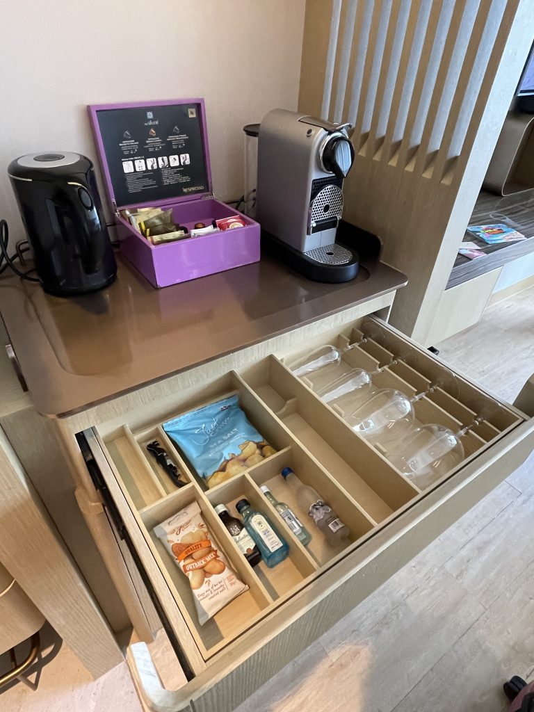 Der Shuttle lädt die Gäste direkt im Level B1 des Hotels ab. Da ich aufgrund des Platinum Status bei der Accorgruppe ein Executive-Zimmer mit Loungezugang bekommen hatte, leitete mich der Concierge nach kurzem Plausch zu den Aufzügen, um den 15. Stock zum Check-in zu erreichen. Sehr cool! Die Executive Club Lounge-Mitarbeiterin führte mich anschließend direkt in die Lounge, damit ich etwas entspannen und ein paar Drinks trinken konnte – währenddessen kümmerte sie sich um den Check-in.